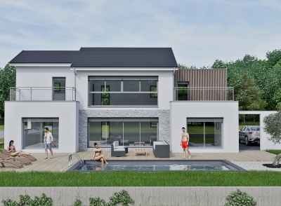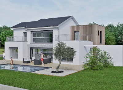 La maison se distingue par des lignes contemporaines et des volumes équilibrés, caractéristiques de l’approche architecturale d’IMO ÉCO.