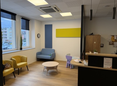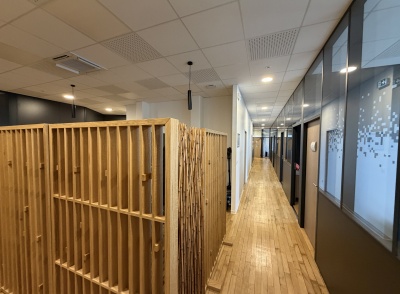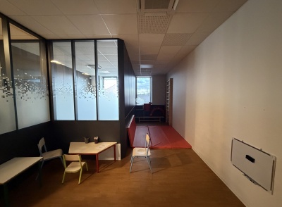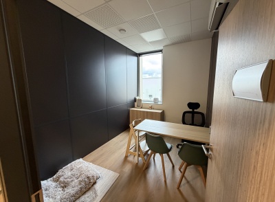 Le projet intègre également l’installation d’un système de climatisation, le choix de couleurs contemporaines et apaisantes, ainsi que la création de cloisons séparatives avec isolation phonique renforcée. Les portes acoustiques contribuent à préserver la confidentialité des échanges et l’intimité des usagers, un enjeu central dans les établissements d’accompagnement.