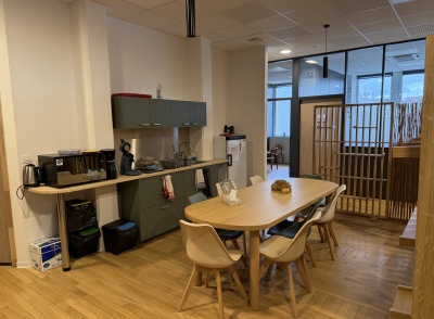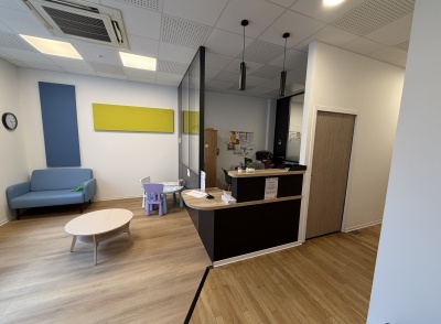 Une salle de pause a été aménagée pour tous les usagers, tandis qu’une salle de bain entièrement neuve a été créée, intégrant un large espace dédié au change des tout-petits. L’accueil des visiteurs et des familles a fait l’objet d’un réaménagement complet, avec la conception et la pose de mobilier sur mesure, exclusivement dédié à cet espace, et la pose d’un parquet moderne, durable et adapté à un usage intensif.