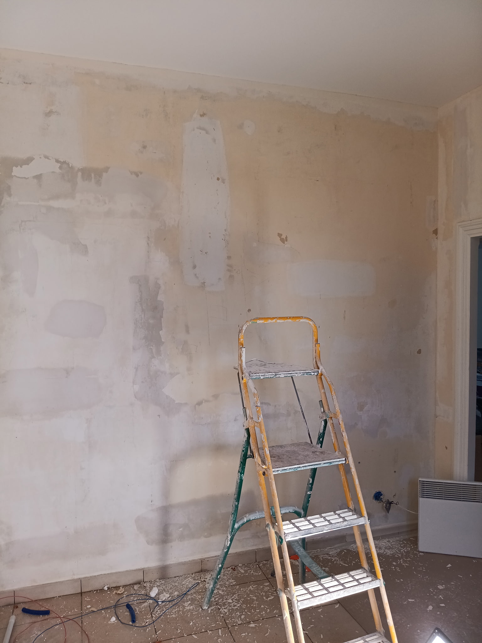 Nous avons ensuite procédé à la réfection complète des murs. Après remise en état et préparation des supports, la pièce était prête à accueillir les nouvelles finitions. Un travail soigné qui garantit un rendu durable et esthétique.