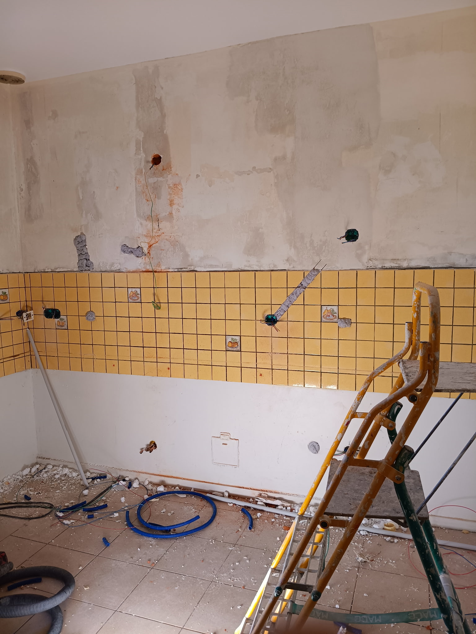 Le chantier a débuté par la dépose totale de l’ancienne cuisine. Les meubles, le plan de travail et les revêtements ont été retirés afin de repartir sur des bases saines. Cette étape est essentielle dans un projet de rénovation de cuisine, car elle permet d’adapter parfaitement les nouveaux aménagements.