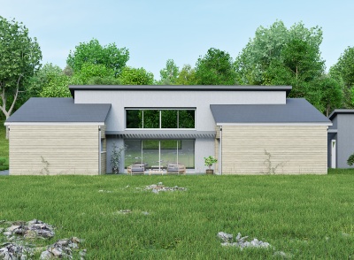 Grâce à la modélisation 3D, chaque espace a été conçu et visualisé avant la construction, permettant aux clients de valider l’agencement, les volumes et les choix de matériaux responsables et de qualité. Une partie de la maison a été habillée en bois, apportant chaleur, élégance et respect de l’environnement.