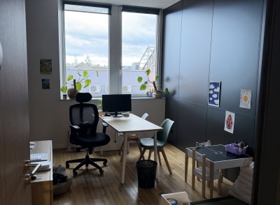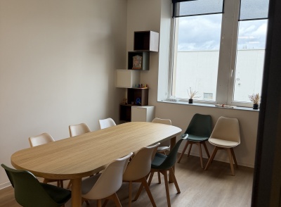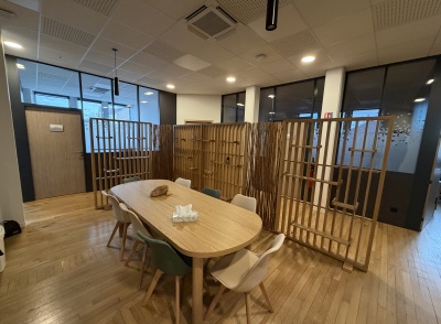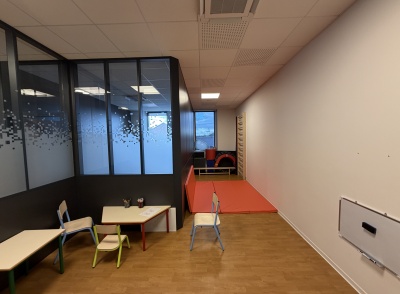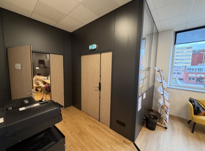 Le projet intègre également l’installation d’un système de climatisation, le choix de couleurs contemporaines et apaisantes, ainsi que la création de cloisons séparatives avec isolation phonique renforcée. Les portes acoustiques contribuent à préserver la confidentialité des échanges et l’intimité des usagers, un enjeu central dans les établissements d’accompagnement.